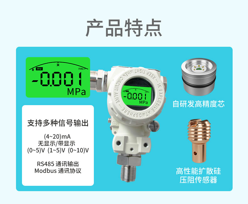 適用場合:壓力變送器選用進口高精度、高穩定性的擴散硅芯體,傳感器內采用電子放大器組成,將測量的電信號轉換成標準信號(電流、電壓、RS485)輸出,可以直接與計算機接口卡、控制儀表、智能儀表或PLC等方便相連,該系列產品廣泛應用于工業過程控制、石油、化工、冶金等行業。