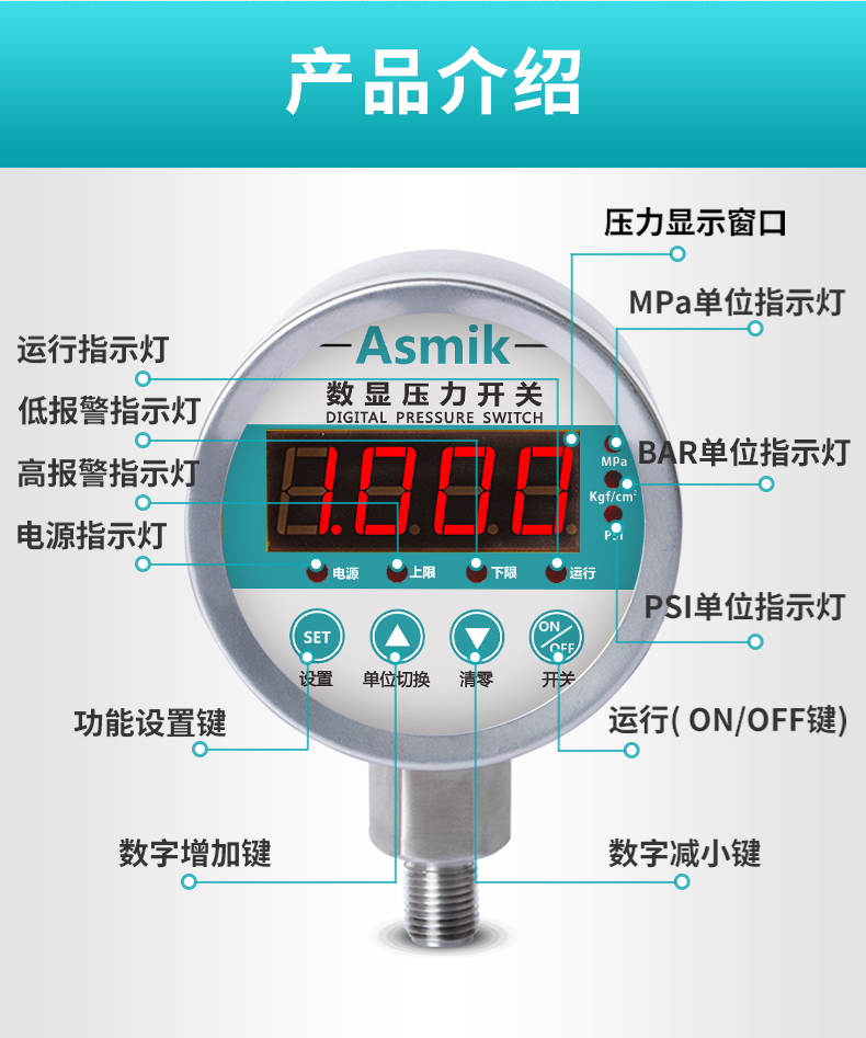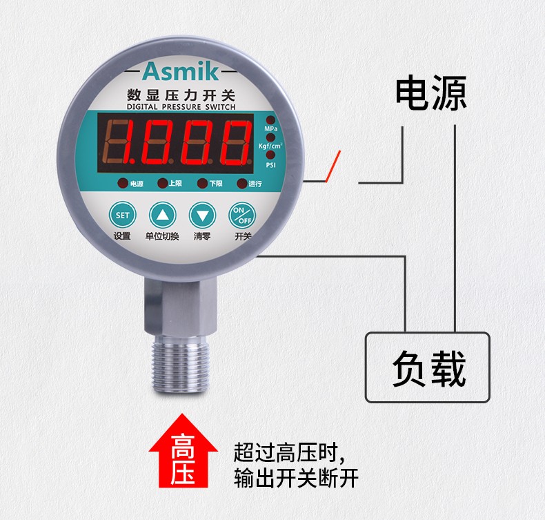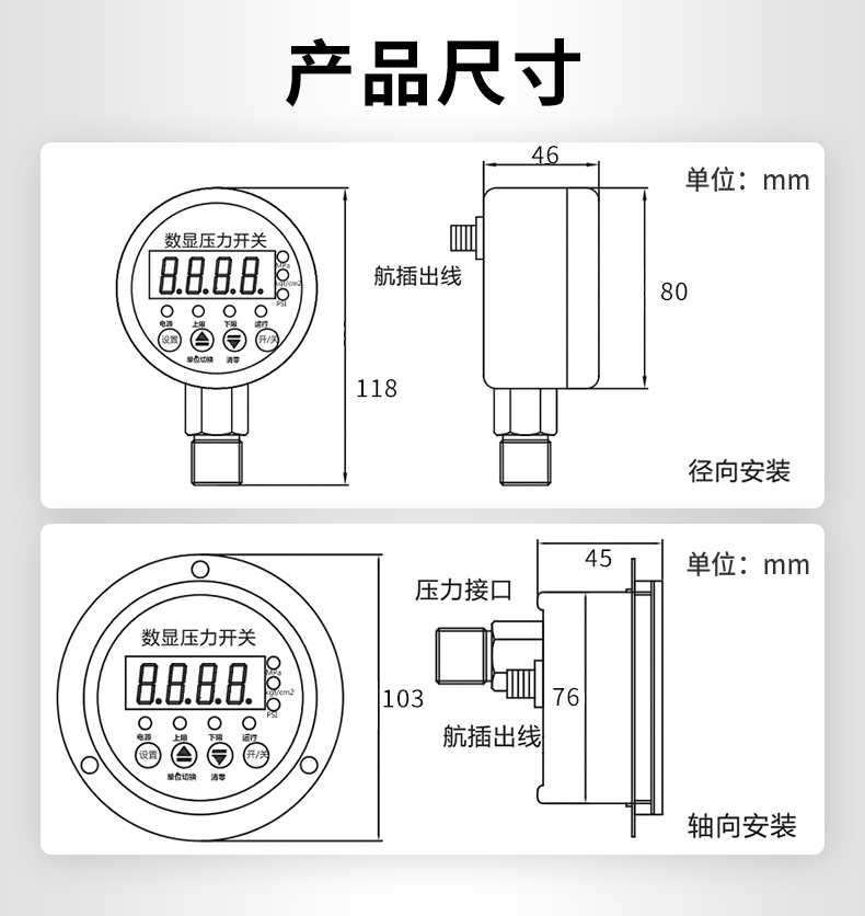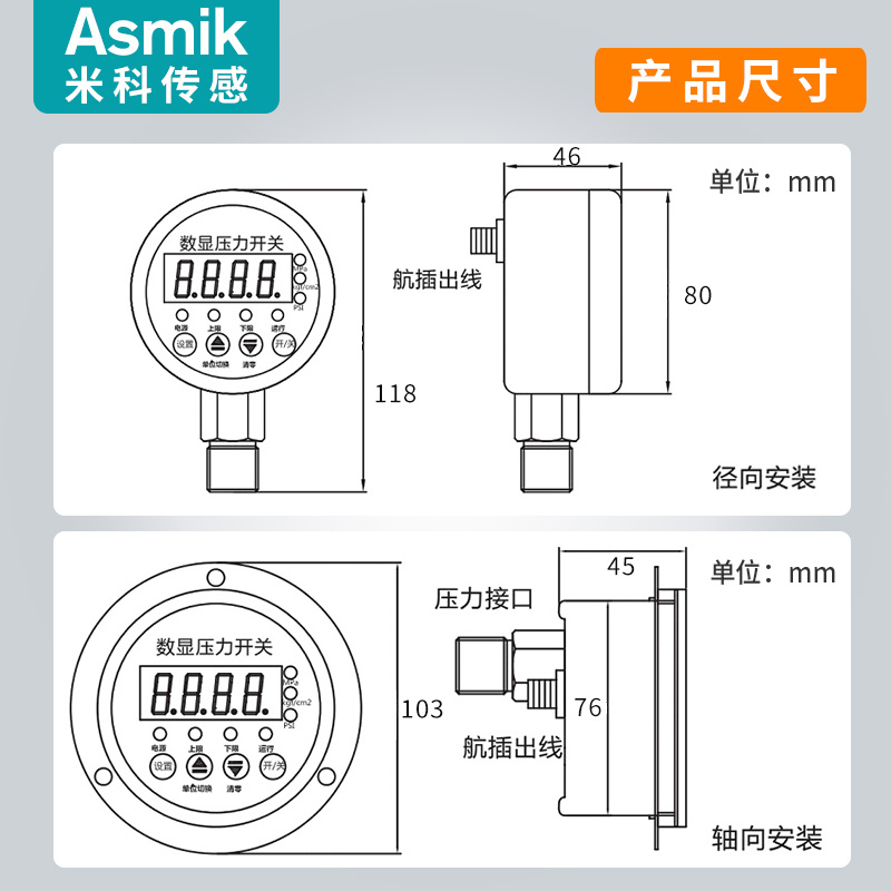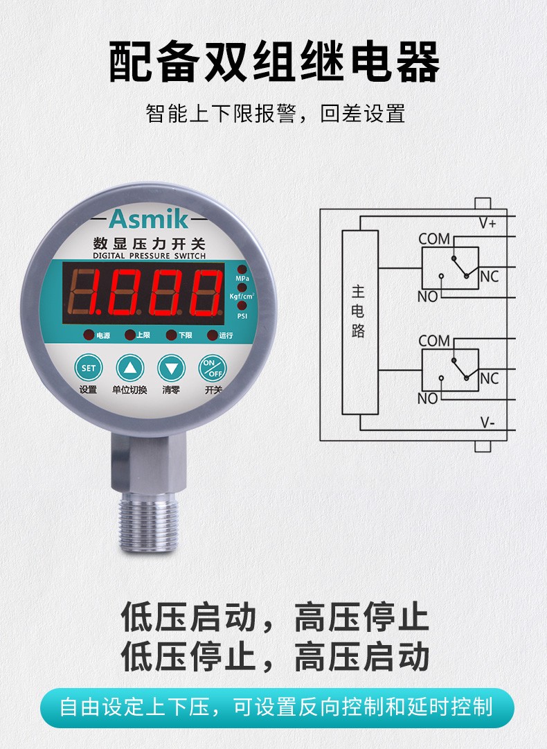 適用場合:數顯壓力開關設計為控制油壓、氣壓、水壓的兩路獨立的壓力監控。并輔以報警方式選擇、密碼保護,延時報警、誤差清零、采樣速率可調等功能,使該產品更準確更智能的實現壓力報警和控制。