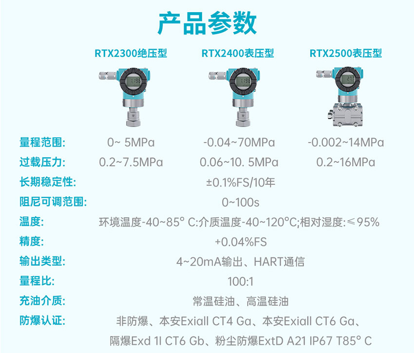 適用場合:RTX2400系列壓力變送器可具有多樣化組態功能,自帶的三按鍵對變送器進行組態調整,可設置如阻尼時間,恒流輸出、報警選擇、顯示單位、置零、以及傳感器檢測等,亦可通過HART進行組態,可實現遠程監控和訪問。是工業壓力變送器是石油、石化、環保、電力、冶金、煤化工等行業壓力測量應用的理想選擇。