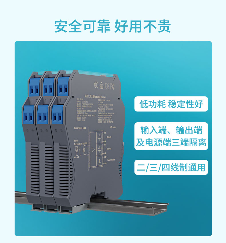 適用場合:本產生是通過干接點、集電極開路信號控制輸出,驅動危險區的本安小功率設備。如電磁閥、聲光報警器等本安設備。輸入端、輸出端及電源端三方隔離。本產品具有可靠性高、響應快等諸多優點??膳c各類儀表及 DCS、PLC 配套使用。