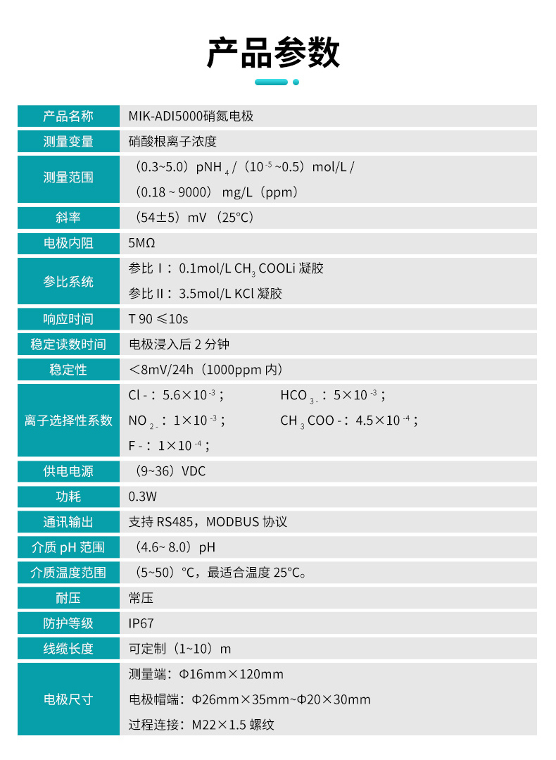 適用場合:硝氮復合電極可直接測量溶液中的氨氮濃度,適用于葡萄酒、啤酒、飲料、肥料、飲用水、天然水、生活污水和工業廢水的氨氮濃度測量。極輸出 RS485 數字信號,RS485-MODBUS 通訊協議配套使用。