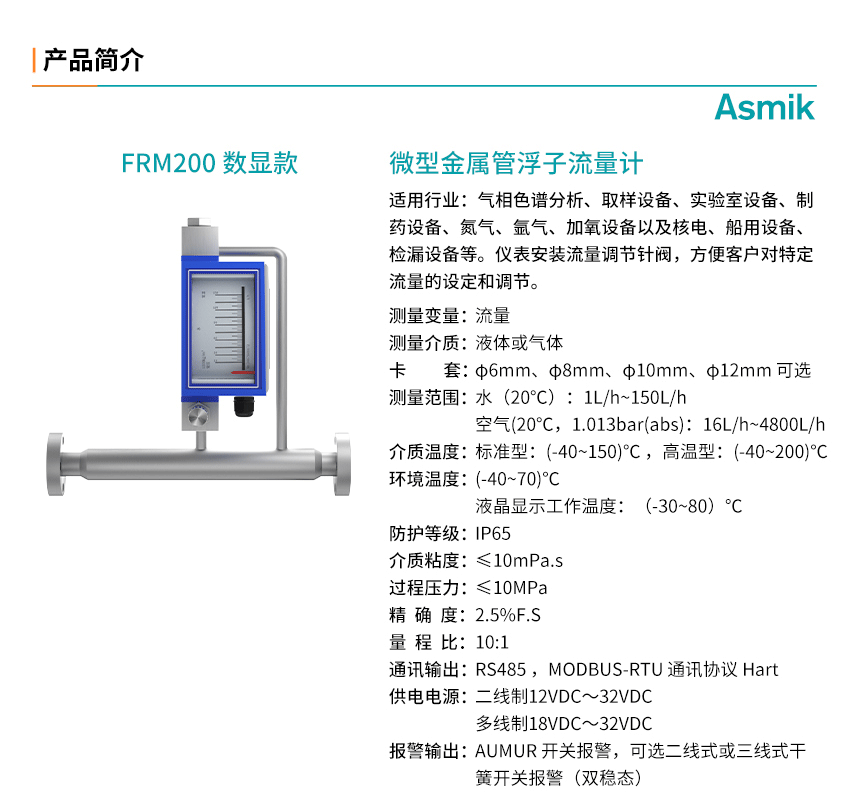 適用場合:米科FRM200金屬管浮子/轉子流量計,可廣泛應用于氣相色譜分析、取樣設備、實驗室設備、制藥設備、氮氣、氬氣、加氧設備以及核電、船用設備、檢漏設備等。儀表安裝流量調節針閥,方便客戶對特定流量的設定和調節。咨詢熱線:400-163-1718